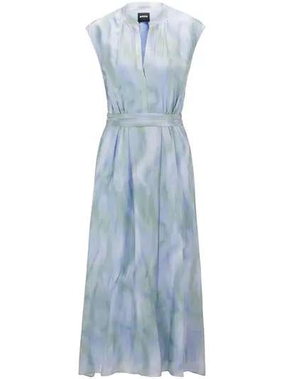 light blue/green/white silk vertical stripe print V-neck cap sleeves concealed side zip fastening belted waist straight hem below-knee length