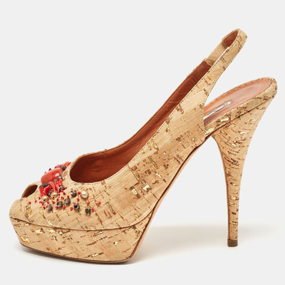 Oscar de la Renta Brown Cork Embellished Slingback Platform Pumps Size 37.5 949117 (коричневый, lpn25614684)