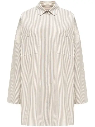 light brown/ivory white cotton poplin texture vertical stripe pattern spread collar concealed front button fastening drop shoulder long sleeves two chest patch pockets two side inset pockets straight hem
