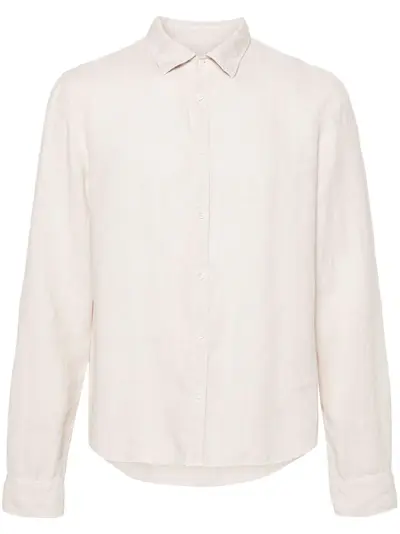 powder pink linen/flax embroidered logo to the front spread collar front button fastening long sleeves buttoned cuffs curved hem