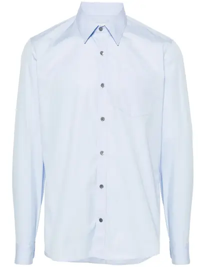 light blue cotton poplin texture straight-point collar front button fastening long sleeves buttoned cuffs chest patch pocket curved hem Model is 188 cm / 74 inches and wears size 48.