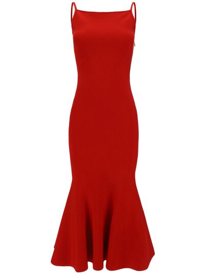bright red knitted construction square neck concealed side zip fastening spaghetti straps sleeveless pencil silhouette flared hem straight hem mid-length