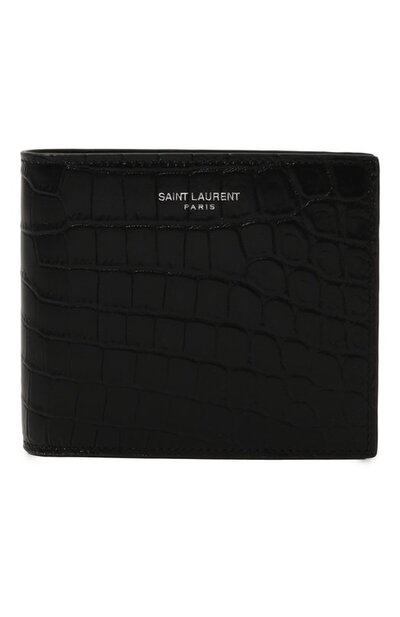 Для пошива черного портмоне двойного сложения использовали плотную кожу с тиснением под крокодила, которое акцентировали легким блеском. Внутри предусмотрели восемь слотов для кредитных карт, два отсека для купюр и два кармана, в которых удобно хранить чеки. Переднюю панель украсили серебристым миниатюрным логотипом бренда.