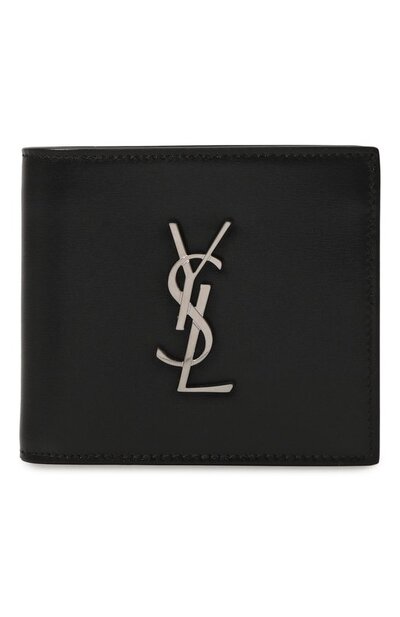 Для изготовления черного портмоне использовали гладкую блестящую кожу, при дублении которой не применяли вредные для природы тяжелые металлы. Переднюю панель украсили крупной серебристой монограммой Кассандра из инициалов Ива Сен-Лорана. Внутри предусмотрели четыре слота для банковских карт, по два отделения для чеков и купюр и карман для монет, закрывающийся клапаном на кнопку.