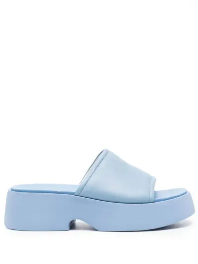 cerulean blue calf leather smooth grain tonal design wide strap open toe slip-on style branded insole platform sole logo at the sole