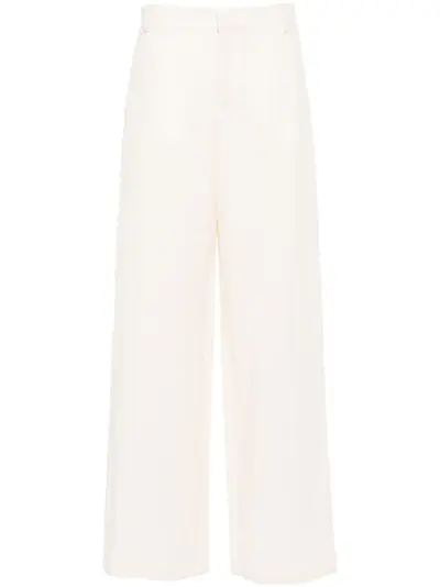 cream white crinkled finish wide leg belt loops two diagonal pockets to the sides two rear patch pockets concealed front button, hook and zip fastening