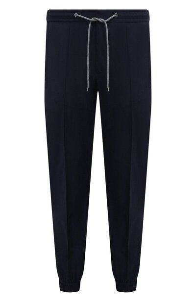 Непринужденным темно-синим джоггерам добавили черты классических моделей, что читается в рельефных стрелках. Лаконичную модель с широким поясом-кулиской сшили из слегка эластичной полушерсти, которая приятно ощущается на теле, поддерживает комфортный микроклимат и практически не мнется.