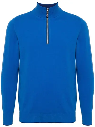 sapphire blue organic cashmere fine knit striped tipping elbow patches branded zip puller high neck short front zip fastening long sleeves ribbed cuffs and hem