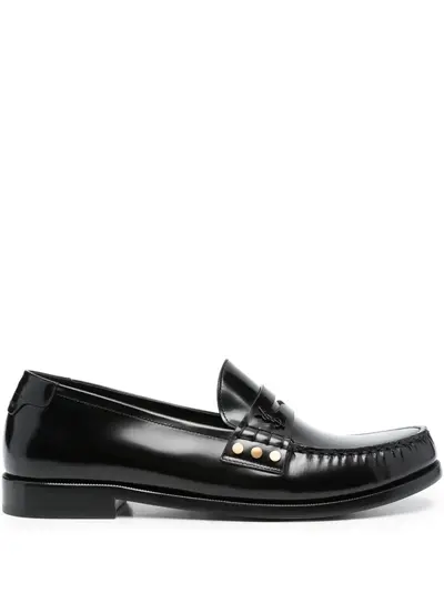 black calf leather patent finish penny slot almond toe branded insole flat sole