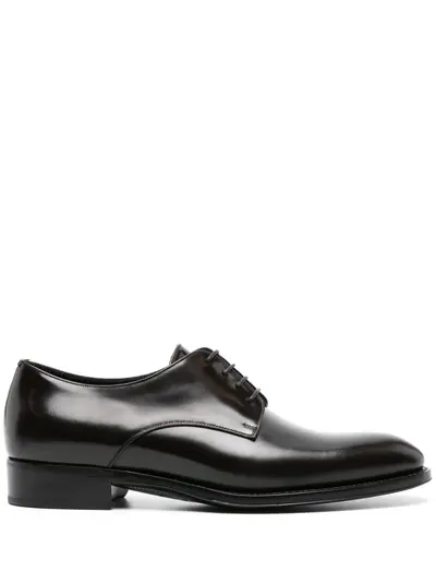 black calf leather glazed finish almond toe front lace-up fastening stacked sole branded leather insole leather lining