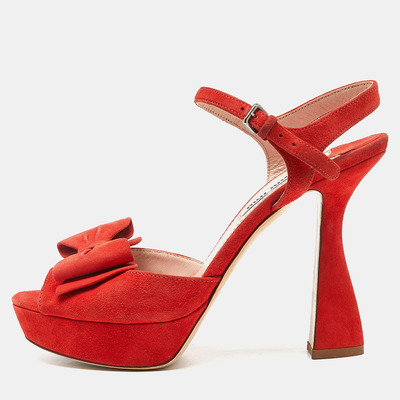 Bring signature style and iconic beauty to your closet with these sandals from the house of Miu Miu. They are created using orange suede, with bow detailing embracing their beauty. They flaunt 12cm heels, ankle straps, and silver tone hardware. These fabulous sandals will certainly make your ensemble look gorgeous.