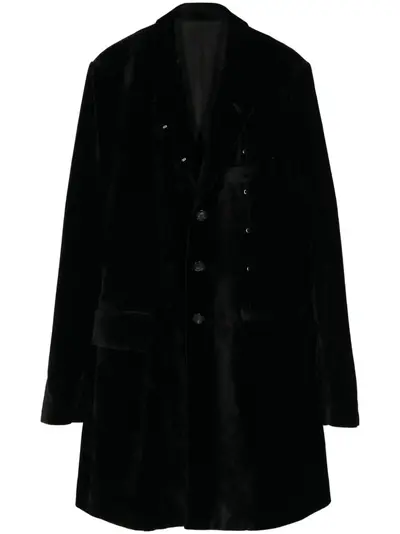 black silk-cotton blend velvet finish notched lapels front hook and eye detailing front button fastening long sleeves buttoned cuffs two front flap pockets mid-length straight hem