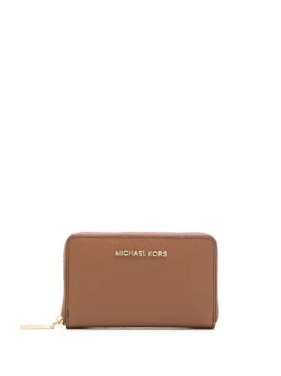 camel brown calf leather pebbled texture gold-tone logo lettering all-around zip fastening internal card slots