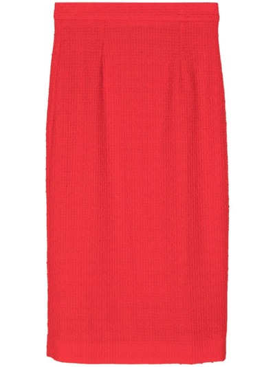 bright red wool blend tweed pleat detailing pencil silhouette concealed rear zip fastening high-waisted rear slit straight hem mid-length