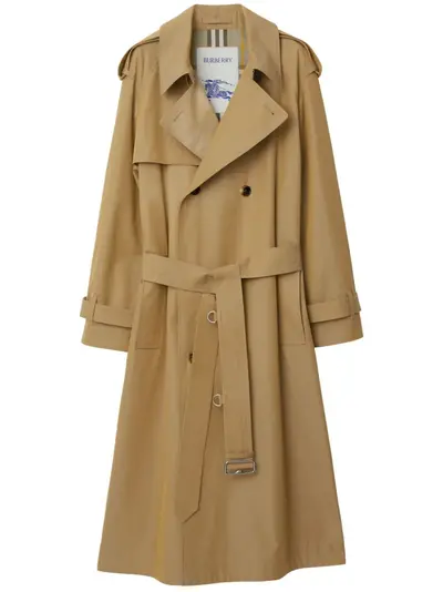 sand beige cotton gabardine weave classic collar double-breasted button fastening epaulettes long sleeves belted cuffs storm flap belted waist two side welt pockets central rear vent Vintage Check-pattern lining straight hem long length