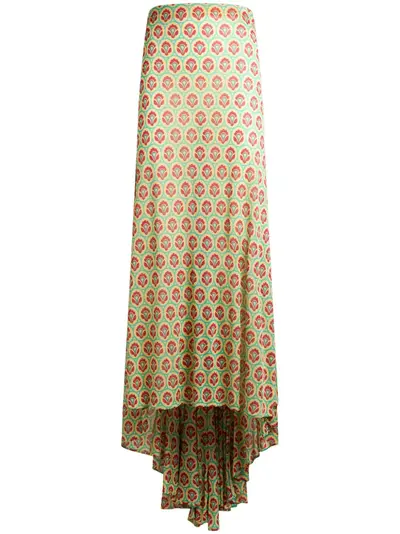 yellow/red/green jersey texture all-over graphic print draped detailing high-rise asymmetric hem train calf-length