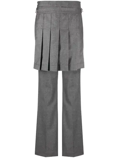 grey wool high waist concealed front fastening detachable pleated skirt side pouch pockets straight leg