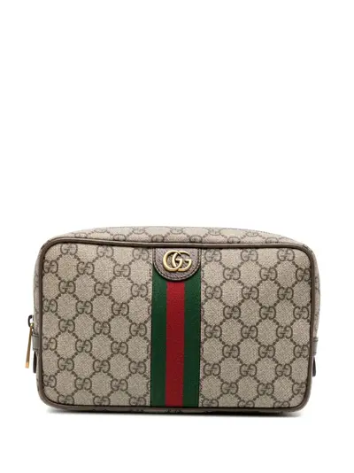 brown calf leather GG Supreme canvas signature Web detailing gold-tone logo plaque top zip fastening main compartment internal zip-fastening pocket
