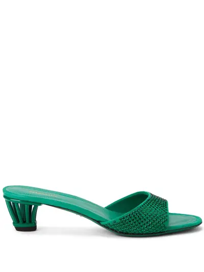 forest green suede crystal embellishment round open toe branded leather insole low sculpted heel