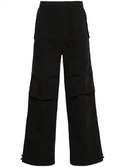 black cotton blend ripstop texture elasticated waistband two side flap pockets embroidered logo to the front drawstring cuffs two rear flap pockets internal drawstring fastening waist