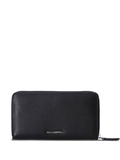black leather signature Ikonik Karl motif silver-tone logo lettering all-around zip fastening partitioned compartment internal card slots internal zip-fastening pocket