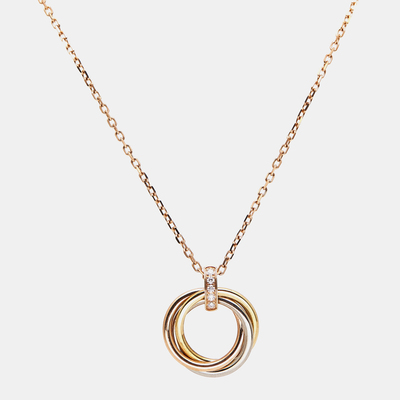 This lovely pendant necklace from Cartier is sure to become one of your favorite accessories It comes crafted from 18k gold and the pendant has the signature Trinity rings in three tone gold.