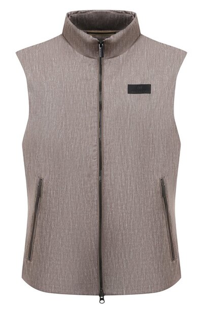 Лаконичный жилет оттенка кофе с молоком поддержит образы любой цветовой палитры и сложности. Для пошива модели использовали мягкую шерсть, а внутри предусмотрели легкий слой синтетического наполнителя, отвечающего за тепло. Два кармана, как и само изделие, застегиваются молниями. На принадлежность марке указывает небольшой патч слева на груди.