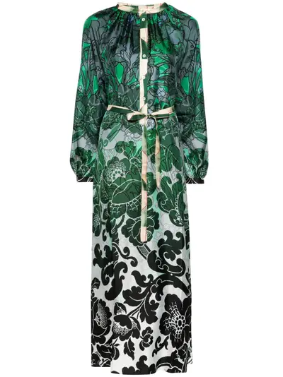 green/blue/black silk textured finish all-over floral print round neck balloon sleeves buttoned cuffs long length straight hem front button placket