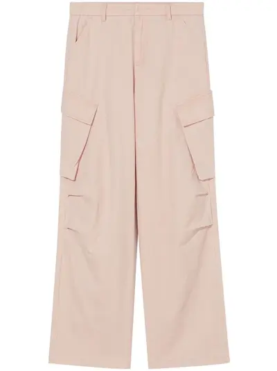 light pink cotton high waist belt loops concealed front button, hook and zip fastening slip pockets to the sides rear flap pocket twisted cargo pockets to the sides pleat detail at knee wide leg straight hem