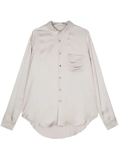 medium grey satin weave raw-cut cut-out to the rear pointed flat collar long sleeves with buttoned cuffs chest patch pocket curved hem front button placket This piece can be styled in multiple ways.