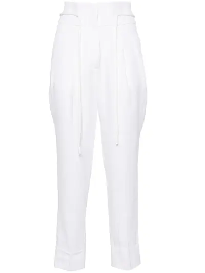 white linen blend pleat detailing high-waisted belt loops concealed front button, hook and zip fastening tied waist two side inset pockets two rear welt pockets turn-up hem cropped leg