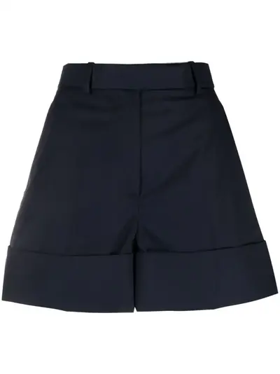 navy blue poplin texture tailored design signature 4-Bar tab belt loops concealed front button, hook and zip fastening two side slit pockets two rear button-fastening jetted pockets turn-up hem thigh-length
