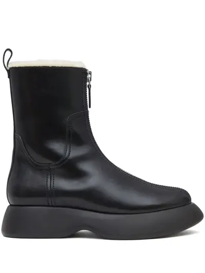 black calf leather almond toe faux-shearling lining front zip fastening pull-tab at the heel chunky rubber sole
