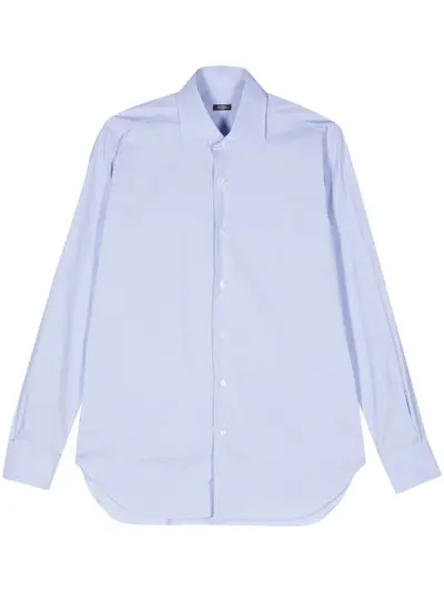 blue cotton poplin texture tonal stitching spread collar long sleeves buttoned cuffs curved hem front button fastening