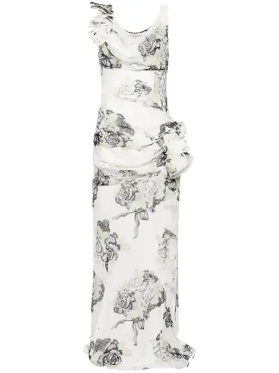 white/black/green silk georgette crepe rose print floral appliqué ruffled detailing cowl neck concealed side zip fastening sleeveless side slit long length silk lining