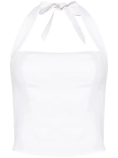 white linen/flax halterneck tie fastening square neck smocked panel straight hem cropped