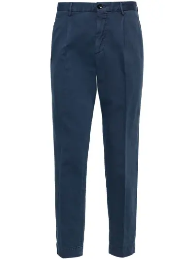 navy blue cotton blend twill weave pleat detailing low-rise belt loops front button and zip fastening two side welt pockets two rear button-fastening pockets cropped tapered leg slim cut