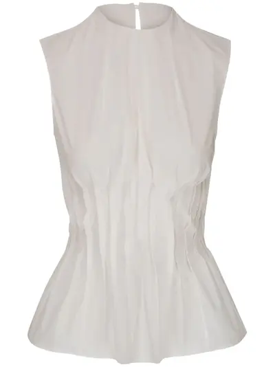 white cotton poplin texture pintuck detailing crew neck rear button fastening grosgrain ribbon trim sleeveless peplum hem