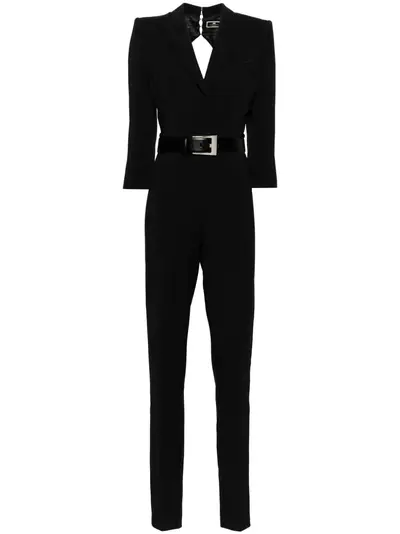 black crepe texture embroidered logo at the chest peak lapels rear hook and eye fastening open back rear zip fastening shoulder pads three-quarter length sleeves buttoned cuffs belt loops detachable waist belt straight leg long length logo-jacquard lining