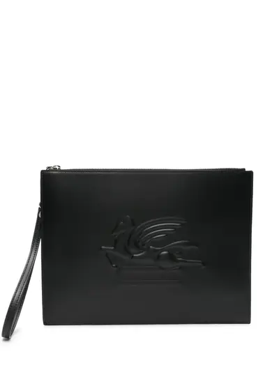 black calf leather signature Pegaso motif embossed logo to the front top zip fastening detachable wrist strap main compartment internal slip pocket logo-jacquard lining