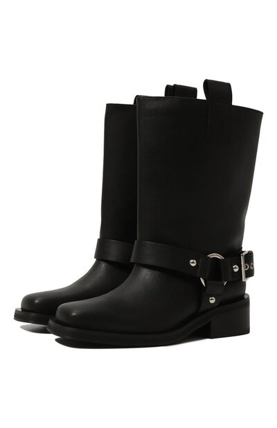 Черные сапоги сшили из прочного экологичного материала, сырьем для которого стали переработанные кожа и полиэстер, сертифицированные GRS. Мыс сделали квадратным, а над устойчивым каблуком расположили ремешки, как на ковбойской обуви. Пара с петлями на широком голенище не нуждается в застежках.