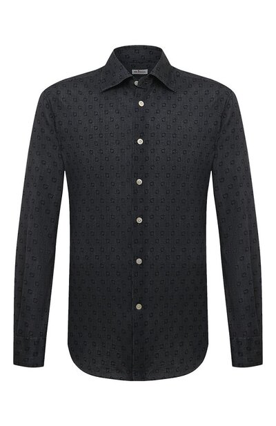 Для пошива темно-серой рубашки выбрали тонкий, немного эластичный материал с черным паттерном. Чтобы модель лучше сидела и образ с ней выглядел опрятно, сверху предусмотрели кокетку, а низ сделали фигурным (так вещь не будет выбиваться из брюк). Изделие с итальянским воротником застегивается бежевыми перламутровыми пуговицами.