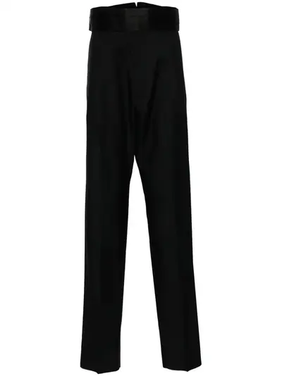 black wool-silk blend satin trim pressed crease high-waisted concealed front fastening belted waist tailored cut two side slit pockets two rear button-fastening jetted pockets