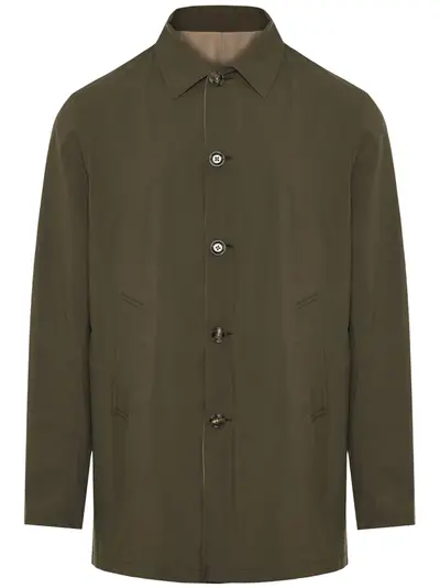 olive green/beige tonal stitching reversible classic collar front button fastening long sleeves two front welt pockets central rear vent straight hem