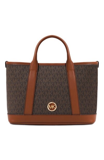 О принадлежности коричневой сумки Luisa бренду, основанному Майклом Корсом, заявляют повторяющиеся принты-монограммы и круглая аппликация с таким же мотивом. Для создания прямоугольной модели с двумя ручками использовали прочный фактурный канвас и гладкий матовый материал, напоминающий кожу. В аксессуар с внутренним карманом, застегивающимся молнией, поместятся планшет, кошелек и телефон. В комплект входит широкий съемный ремень, позволяющий носить изделие на плече.