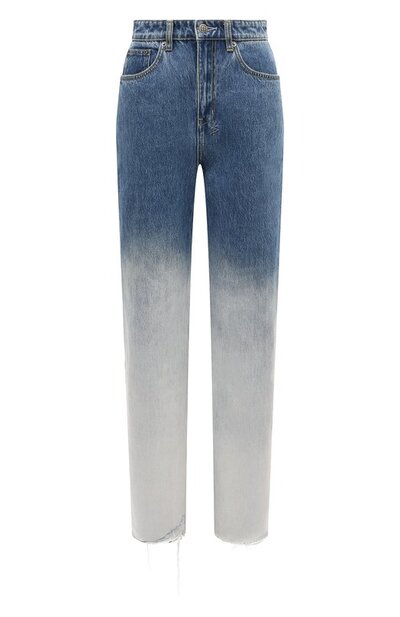 Прямые джинсы из плотного хлопка выбелены в фирменной технике Glacier, которая создала градиентный переход от насыщенного голубого оттенка к почти белому. Более темный участок денима сзади на поясе имитирует след от утерянного патча. Под ним вышили эмблему 3x4, а правый задний карман подчеркнули накладкой со слоганом Royalty heroism and the streets. Нижний край оставили необработанным, сформировав на нем крупные потертости.