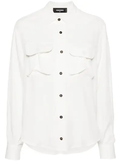 white crepe texture straight-point collar long sleeves with buttoned cuffs two chest flap pockets box-pleat detail high-low hem front button fastening