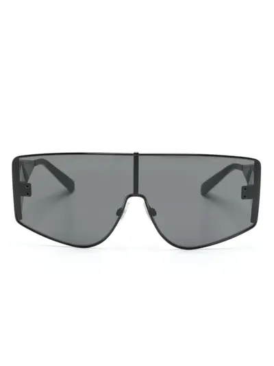 shield frameblack metal shield frame tinted lenses nose pads logo-engraved arm oversize arms with shield frame curved tips These glasses come with a protective case.