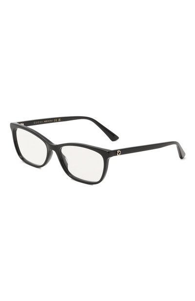 Черную прямоугольную оправу изготовили из легкого прочного ацетата. Материал быстро перенимает тепло кожи, поэтому в аксессуаре с узкими ободами, не загораживающими обзор, будет комфортно в любую погоду. На принадлежность марке указывает накладка в виде архивной монограммы GG на дужках.