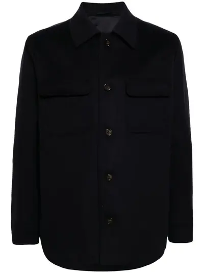 navy blue wool-cashmere blend tonal stitching spread collar front button fastening long sleeves buttoned cuffs two chest flap pockets straight hem